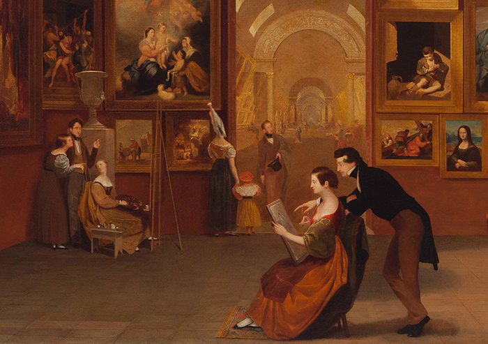 Morse painted biographical information into his monumental work. He depicts himself leaning over his daughter sketching in the foreground; friend and author James Fenimore Cooper stands in the corner at left with his family; and Morse's roommate in Paris, American sculptor Horatio Greenough, strides into the gallery holding his hat. Detail of Gallery of the Louvre, Terra Foundation for American Art, Chicago.