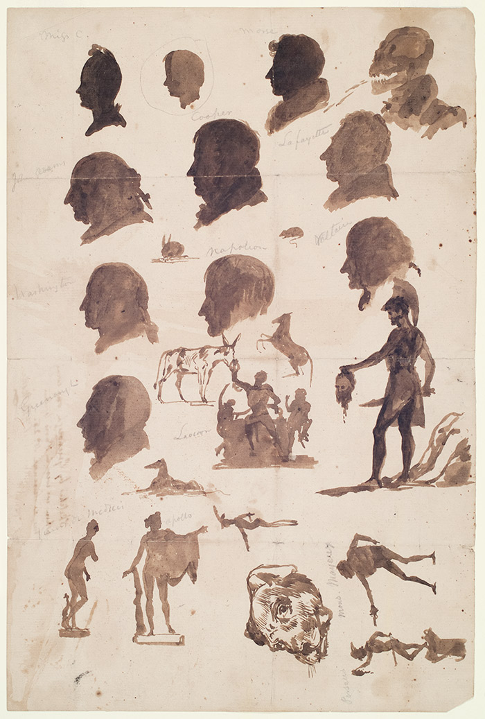 The connection lies in the friendship between Morse and Cooper, who both belonged to the Bread and Cheese Club, an artistic and literary circle that Cooper started in a New York City bookstore owned by his publisher. It turns out the two men also belonged to another club of sorts, along with American sculptor Horatio Greenough, who appears in Gallery of the Louvre to the right of the Coopers, holding his top hat in his hand. (The Huntington has Greenough’s sepia-on-paper Silhouettes (1831) among its art holdings.)