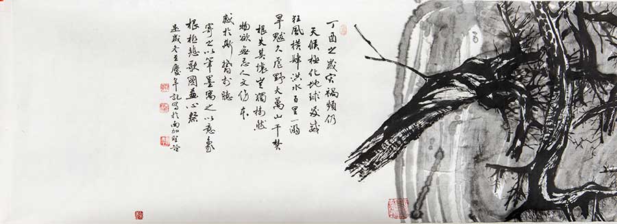 Tang Qingnian 唐慶年, born 1956, Chinese and American. Detail of Illustrations to the Rhapsody on a Barren Tree, 2017. Handscroll, ink, and light color paper. Courtesy of the artist. Tang's colophon, composed in classical Chinese, appears in this final scene of the 38-foot handscroll.