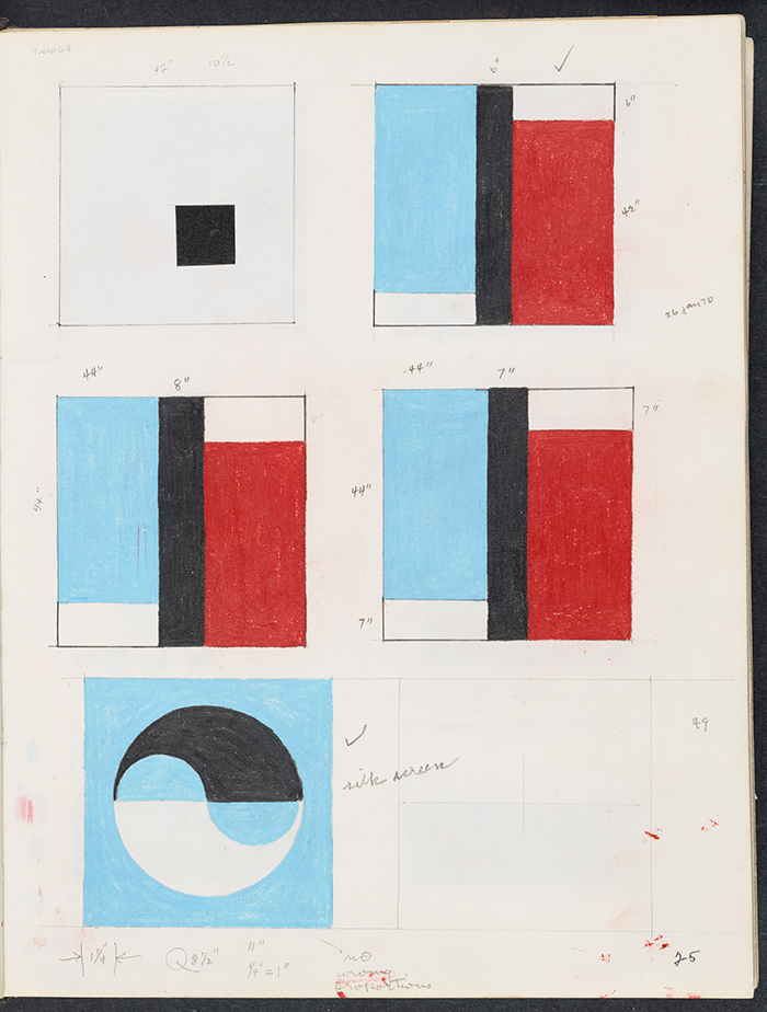 Frederick Hammersley (1919–2009), Studies for Adam & Eve, #2 1970, and Seedling, #4 1967, Page 25 of Composition Book, Sketchbook with graphite and colored pencil, 10 7/8 x 8 1/4 in., Getty Research Institute. Copyright Frederick Hammersley Foundation.
