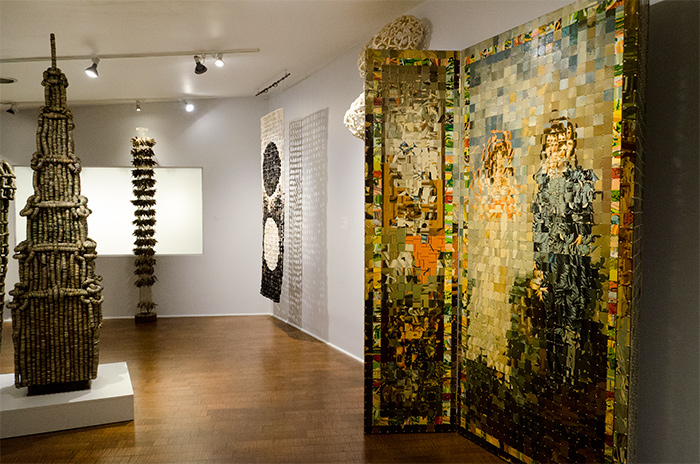 The folding screen stands alongside whimsical and impressive sculptures of bottlecaps, puzzle pieces, Scrabble tiles, buttons, and the like.