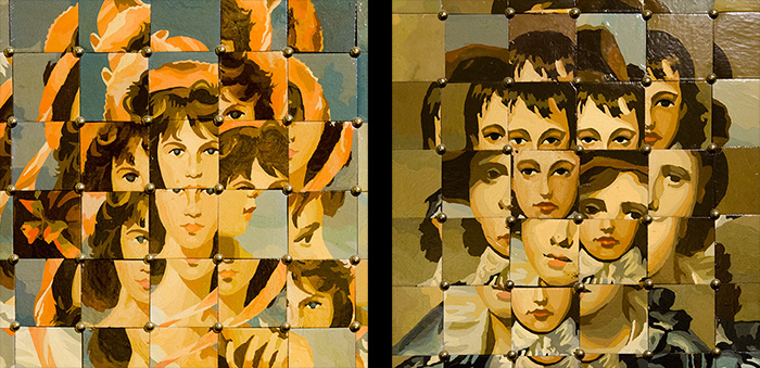 Graham’s reimagining is a delight. In it, Pinkie and Blue Boy—eternally paired in the popular mind even though they were painted by two different artists and 24 years apart—no longer face one another as they do in the gallery; they now stand side by side as they greet viewers. Each is composed of a multitude of squares cut from quite a few paint-by-number interpretations of the masterpieces and reassembled in an orderly-yet-jumbled grid, with features like eyes and mouths and fabric folds repeating in a cubist visual swarm that’s kept in check by steadfast horizontal and vertical seams punctuated with round upholstery tacks. It reads as both an irreverent send-up and a doting homage to the pair of European paintings that had never met before Henry Huntington first introduced them here in San Marino back in the 1920s.