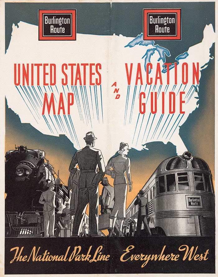 Burlington Route, United States Map and Vacation Guide, cover, 1938. The Huntington Library, Art Collections, and Botanical Gardens.
