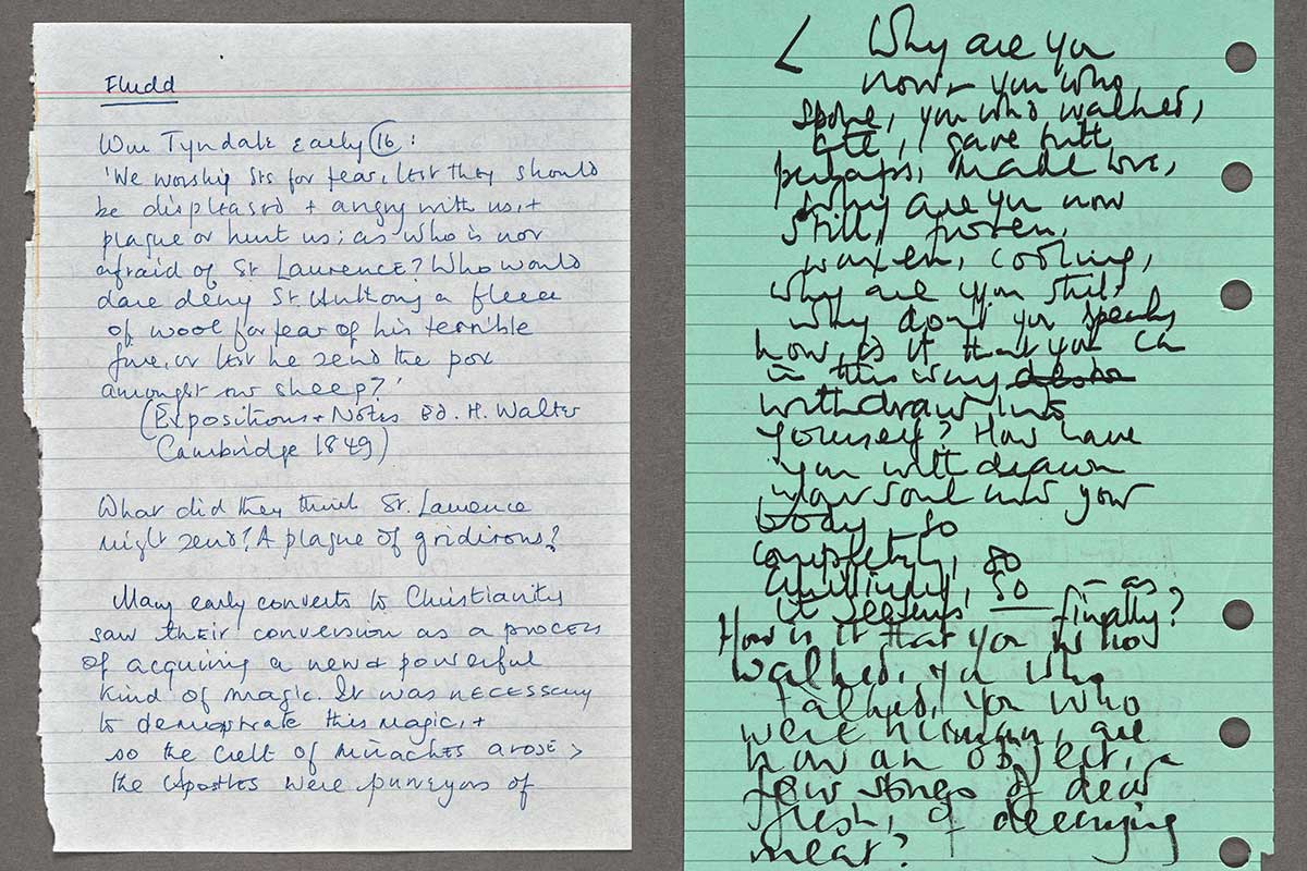 Hilary Mantel's notes Left: Hilary Mantel’s notes on William Tyndale’s view of saints for her novel Fludd (1989). The Huntington Library, Art Museum, and Botanical Gardens. Right: Anatomist John Hunter addresses the dead in an early draft of Hilary Mantel’s novel The Giant O’Brien (1998). The Huntington Library, Art Museum, and Botanical Gardens.
