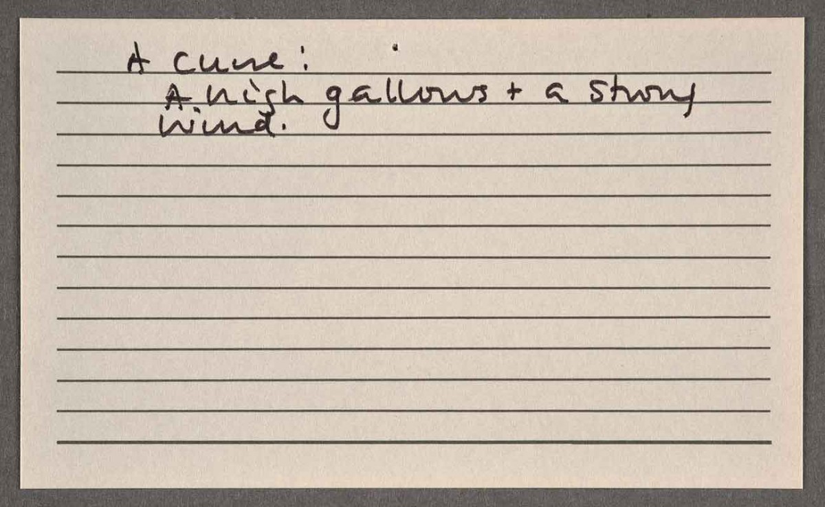 Hilary Mantel's notes Left: Extract from a small pocket notebook of Hilary Mantel’s research notes. The Huntington Library, Art Museum, and Botanical Gardens. Right: Hilary Mantel’s notes on “What’s the Alternative,” an advice column in the Style Magazine of the Sunday TimesThe Huntington Library, Art Museum, and Botanical Gardens.