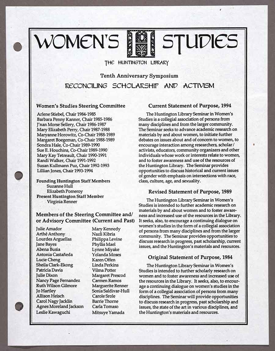 Statement of Purpose of The Huntington Library’s Women’s Studies Symposium in 1994. Members of the Steering Committee were leading figures from across disciplines. The Huntington Library, Art Museum, and Botanical Gardens.