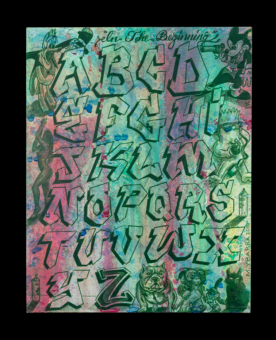 Ybarra Jr.'s In the Beginning is a kind of origin story for novice graffiti writers, calligraphers, scribes, tattoo artists, and all-manner of budding blue-collar artists. The graffiti-style alphabet, with cartoon characters alongside naked women, serve as basic cultural references, picked up from television or the street, learned in childhood. The drawing points to the work of repetition and ritual that must be performed again and again before the artist can ascend to higher expression and eventually achieve a unique style.