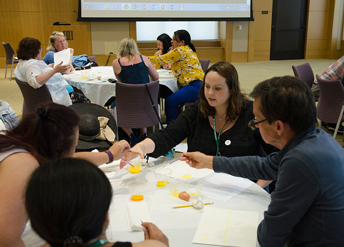 Klein demonstrates how to separate egg white from the egg yolk—noting the importance of removing the yolk membrane before including it in a mixture to make yellow dye. Photo by Lisa Blackburn.