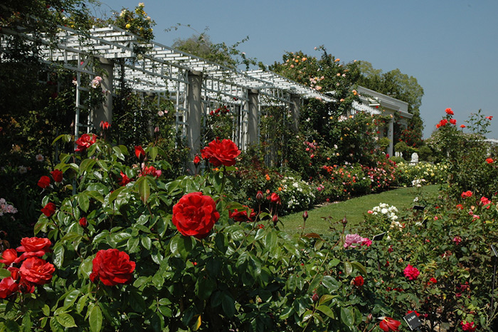 Less water, more blooms? The Huntington’s Rose Garden is more beautiful than ever, thanks in part to the smoky-red ‘Hot Cocoa’ roses (seen in the foreground), a hybrid by rose curator Tom Carruth.