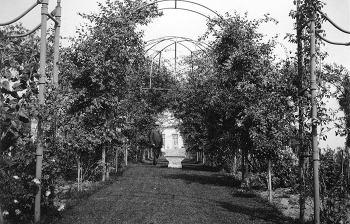 Henry E. Huntington stands under an arbor in the Rose Garden around 1916. The Huntington Library, Art Collections, and Botanical Gardens.