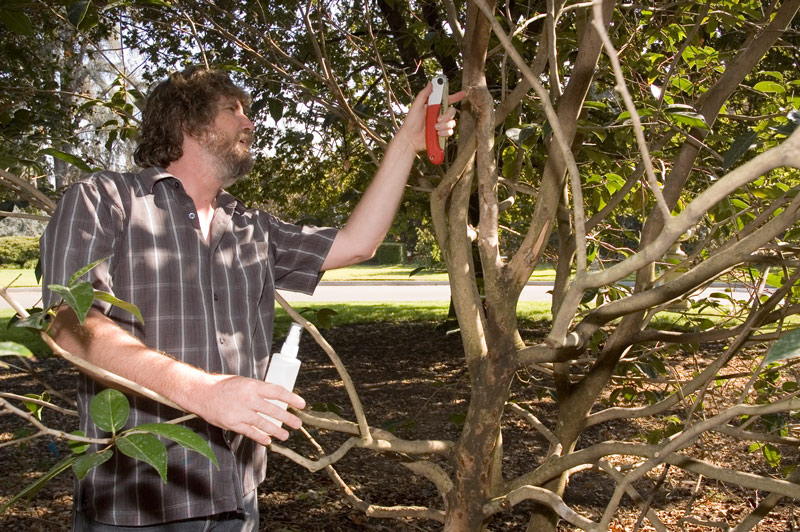 Tim Thibault, The Huntington’s curator of woody collections, looks for signs of infestation in the Camellia semiserrataspecimen. In his right hand he is carrying isopropyl alcohol to disinfect his garden tools, thereby avoiding contamination of other plants with the deadly fungus, or fusarium, that the beetles leave behind. Photo by Lisa Blackburn.