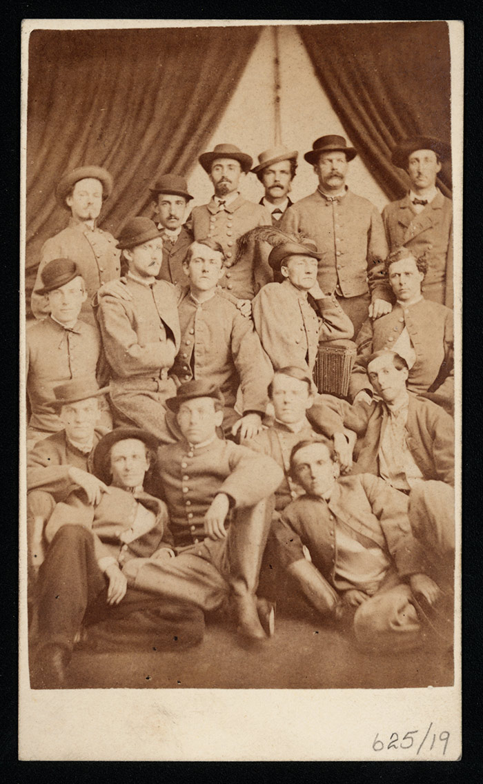 Col. John S. Mosby and Some of His Men, ca. 1863, printed later. Albumen carte-de-visite print. Confederate commander Mosby, seated and wearing a feathered cap, earned the nickname “Gray Ghost” for his lighting attacks and ability to elude capture. Photograph by Lee Gallery (active 1870s). The Huntington Library, Art Collections, and Botanical Gardens.