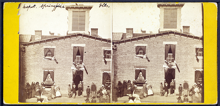 Great Western Depot, Springfield, Illinois. 1865. Albumen stereographic print. Dark bunting shrouds the railroad depot, the final stop of Lincoln’s funeral procession. Attributed to Schreiber & Glover (active ca. 1864–66). The Huntington Library, Art Collections, and Botanical Gardens.