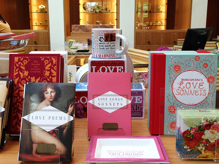 A book of Shakespeare’s sonnets, illustrated by Caitlin Keegan, sits on a table devoted to love and friendship. Not far away is a sterling silver necklace inscribed with a loving quote from naturalist and painter John James Audubon of Birds of America fame. (“I have wished for thee, every day, every moment,” wrote Audubon to his wife, during an extended bird-watching expedition.)